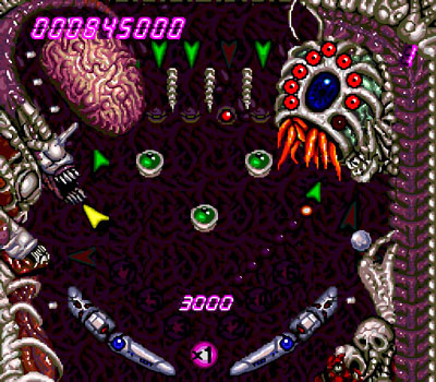The music is amazing and very appropriate for the game and era it was produced in (spooky sounding late 80’s techno). Though the sound effects are flat explosions and thuds, you’re too busy jamming out to one of the two soundtrack songs to care. We were going to do a comparative review between Alien Crush and Alien Crush Returns, but Alien Crush Returns is far too much of a step up to even have them run head to head. Honestly, the only reason you should consider buying Alien Crush over Alien Crush Returns is if you’re seriously on a budget and can’t afford 200 extra points or for the sake of nostalgia. Otherwise, Alien Crush Returns is a much better buy, hands down. That’s not to say that the original is bad or even mediocre. As I mentioned before it’s an amazing game, but considering what’s available on the same system for $2 more it just can’t compete. Alien Crush Returns (ACR, from here on out) plays nearly identically to the original. However, our favorite living alien pinball table got an amazing 3-D face lift and also brought a few of its friends. The 3-D is absolutely stunning in this game. Its graphics are so visually interesting that I’ll sometimes lose a life/ball watching the table breathe or do some other strangely interesting animation. While I only played on 5 of the 6 boards since getting this game, I must say that they’re all very well designed. Every board carries similar design integrity, yet are varied enough so they’re actually very distinct and distinguishable. The saddest part of the audio-visual presentation was the music. After playing the game for several hours I still can’t tell you how any of the songs sound and as I mentioned in another game article. Music I blank out of my memory must be infinitely worse than music that’s at least catchy enough to get stuck in my head.