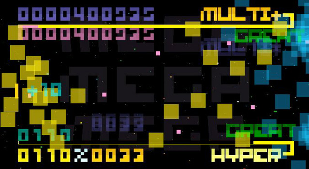 The gameplay is very simple. The game plays like an extreme version of Pong. Little bits of debris come from the right hand side of the screen which you must knock away with your paddle man. Since Bit.Trip Beat is on the Wii platform, it works with that motion control stuff we’ve come to know and love (or hate). You hold the Wiimote horizontally and turn it as if it was some radio dial (wow, that’s pretty dated) in order to move the paddle man up and down. The debris patterns start off very simply, mostly being a few consecutive lines of dots. However, as the game progresses the patterns become pretty intense, coming at you in an angular formation or in snake like patterns. Do well and you’re rewarded with even more music, sounds and colors; do bad and you’re game turns into something that looks and sounds like an old black and white Atari game.