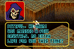 Adding to the clusterfuck of a design choice is the "ouch" recovery animation that He-Man goes through whenever injured - an animation that both you and enemies have - the difference being that enemies become immune to further attacks during their animation, while He-Man is vulnerable to damage before his recovery animation completes. Furthermore, if He-Man simultaneously attacks an enemy just as they attack him, it counts as a stalemate and neither is damaged nor deals damage. This is true for all of He-Man's possible attacks - even his "charge-up whirlwind" attack will not override the basic attack of most enemies. You'll hear a little metal-on-metal "clang" sound with no effect. It is unclear whether the designers purposely integrated this into the combat system in an effort to evoke "realism" or to make the game hard enough that you can't waltz through it spamming the B-button. In either case, their implementation is flawed and rife with bugs.