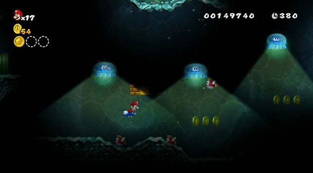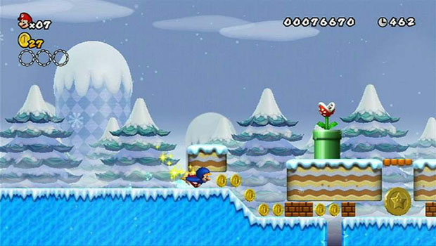 The controls in this game are very solid. Everything is responsive and does exactly what it should. The 2 motion sensing actions work well in this game and aren’t intrusive or feel like they’re tacked on. However, fans of previous Super Mario games will immediately notice that the controls feel subtly different. While Mario used to have programmed physics that were similar to a slippery brick, he now feels a little weightier and more organic. It seems to take Mario just a bit more time and distance to accelerate up to a decent speed which subsequently affects his jump distance as well. At first I thought this had to do with the fact that I’ve been forced to use the stiff directional pad found on the Wiimote (and possibly because I was piss drunk when I first started my playthrough); however, after several hours of play, this is clearly something in the programming. It takes a bit to get used to, but really isn’t a big issue. As mentioned before the game does manage to showcase a couple new tricks while remaining very true to its predecessors at the same time. The most notable addition to this game is the multiplayer option. As Gavin will mention, the days of taking turns are in the past as you now can play a Super Mario Bros game with up to 4 players at once. There are a couple modes in multiplayer mode, none of which I’ve played yet (mostly because I’m waiting to be the jerk that dominates others in game simply by knowing the secrets and keeping them to myself). However, from what I’ve heard and seen of the multiplayer, it makes me a little sad that I don’t have a steady girlfriend to enjoy the multiplayer with. Along with the multiplayer mode Nintendo has also added a few new power ups to the game. You have power ups from other Super Mario games, such as: the micro mushroom from New Super Mario Bros. DS and the ice flower from Mario Galaxy. You also get some totally new power ups like the penguin suit and the propeller mushroom too. The new power ups are pretty fun for the most part, though the ability to shoot ice and the propeller can make the game easy to the point of pointlessness if they’re abused/over used.