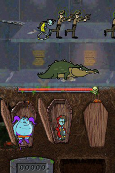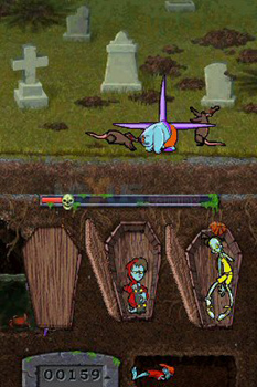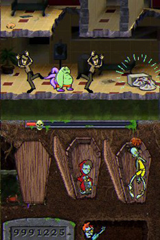 Though this is a very fun game with a excellent story and presentation, it does fall very short in the audio department. Aside from the awesome voiced intro, the game’s general audio is just plain bad. It honestly sounds like the crappy sound effects that come out of a generic Newgrounds or eBaums World flash game. It was tolerable for the first half hour of gameplay, after that I ended up just muting my DS and never looking back. The biggest negative point in this game isn’t the music; it’s the mini-games in this game. By now you should all have a general idea as to how much I hate mini-games; however, these mini-games are seriously pointless. The only thing they give you is more points, which would be fine aside from the fact that you can just keep exploiting the “replay mini-game” option to make some artificially high score. Just in case you’re curious or have a younger sibling that likes mini-games, they mostly consist of: doing free throw shots in a form of zombie basketball, playing an old 80’s style zombie slaying video game, skating around in a half pipe ala 720, etc. They’re not very fun and I often just use the time to take a 60 second hand stretching break.